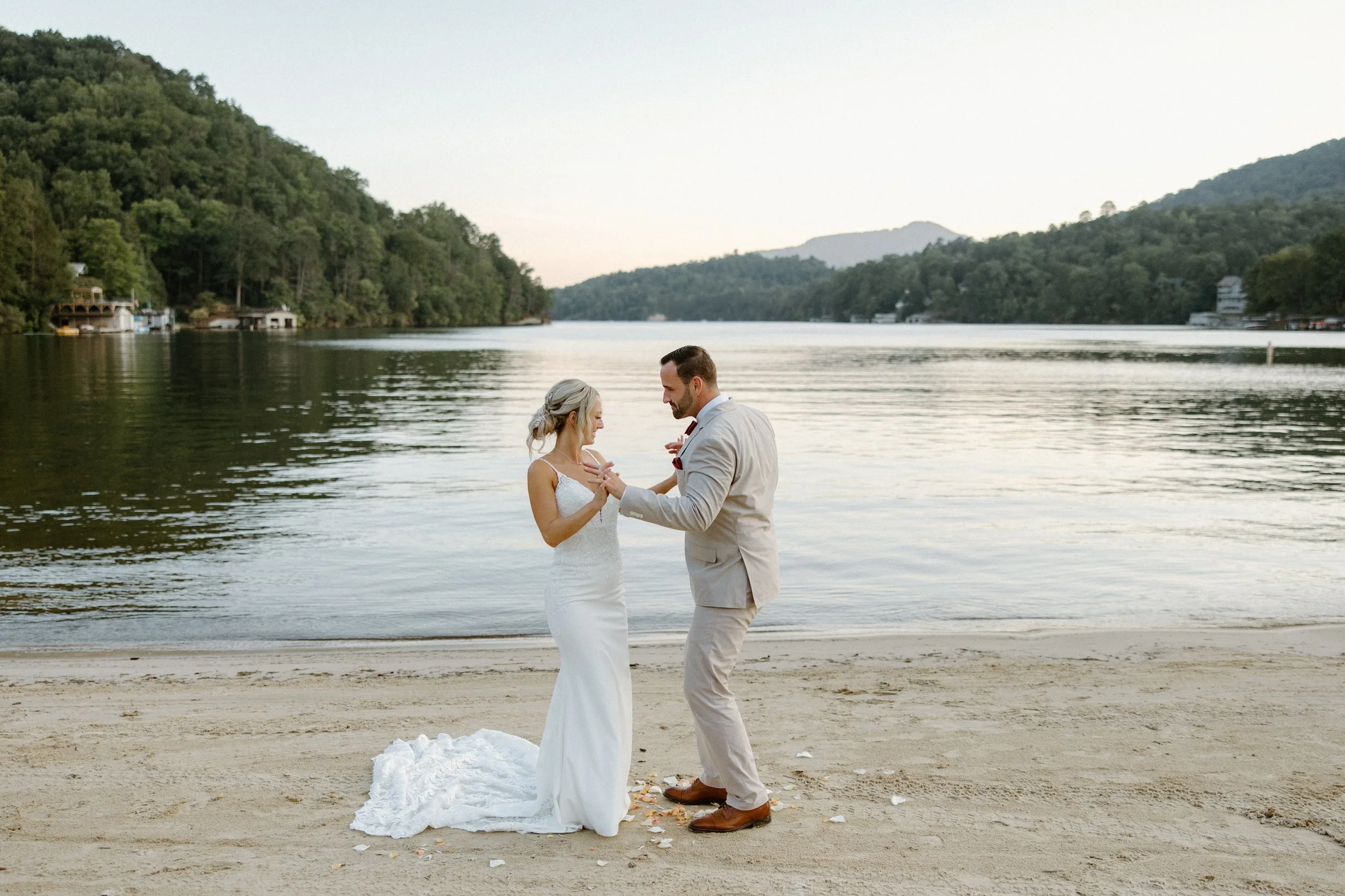 On the hottest day of the year, love radiated even brighter as Sabrina and Brian, embarked on their enchanting journey at the Rumbling Bald Resort in Lake Lure, North Carolina. Despite the scorching temperatures, the shores of Lake Lure provided a breathtaking setting for a wedding that transcended the heat with its warmth of love. The day unfolded with dawn casting soft hues across the sky, creating an atmosphere charged with anticipation. The Rumbling Bald Resort, nestled between the Blue Ridge and Smoky Mountains, became the canvas for a celebration that blended the grandeur of nature with the intimate stories of the couple.